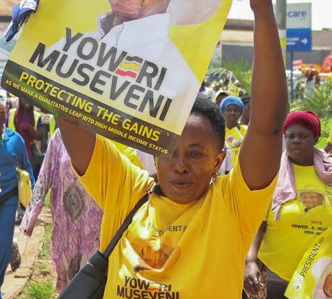 ويسير أنصار الرئيس الأوغندي وزعيم حزب حركة المقاومة الوطنية الحاكم، يويري موسيفيني، في الشارع قبل حضور تجمع انتخابي له في كمبالا، أوغندا، في 13 يناير/كانون الثاني 2026.