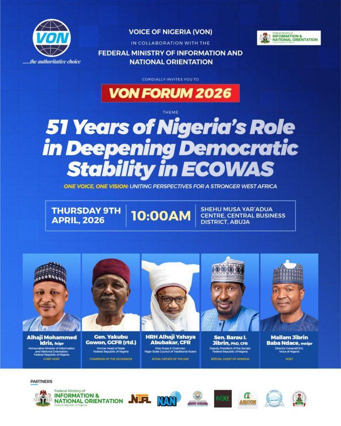 تستضيف إذاعة صوت نيجيريا، يوم الخميس، منتدى رفيع المستوى في أبوجا، احتفاءً بمرور 51 عامًا على إسهام نيجيريا في تعزيز الاستقرار الديمقراطي في منطقة المجموعة الاقتصادية لدول غرب أفريقيا. ويجمع المنتدى شخصيات بارزة، وباحثين، وإعلاميين، وصناع سياسات، للحوار والتأمل في الدور الإقليمي الراسخ للبلاد